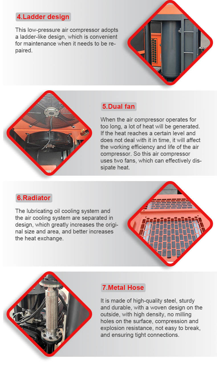 Special low pressure screw air compressor for textile industry,According to the user’s working pressure, the internal compression ratio is automatically adjusted, and the best specific power can be maintained within the exhaust pressure range of 0.2~0.5Mpa. The forced lubrication of the oil pump is used to ensure sufficient fuel injection and the best air-air mixing ratio under extremely low exhaust pressure.